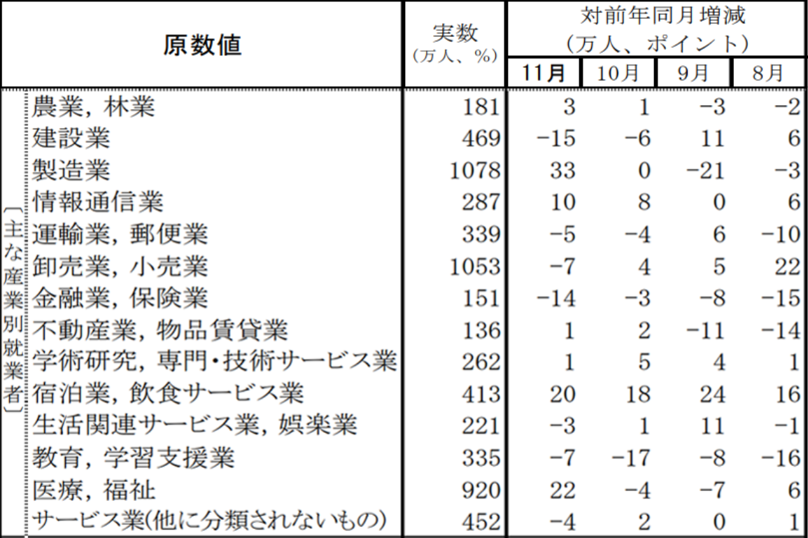 主要产业就业者与去年同月相比,“制造业”(增加33万人)、“医疗、福利”(增加22万人)、“住宿业、饮食服务业”(增加20万人)等行业的从业人数增加;“建造业”(减少15万人)、“金融业、保险业”(减少14万人)的从业者同比去年同月减少较多。